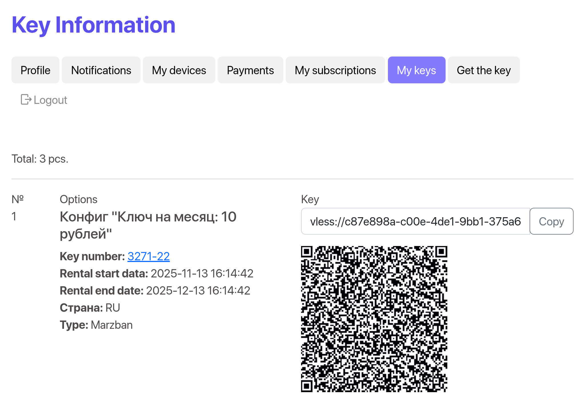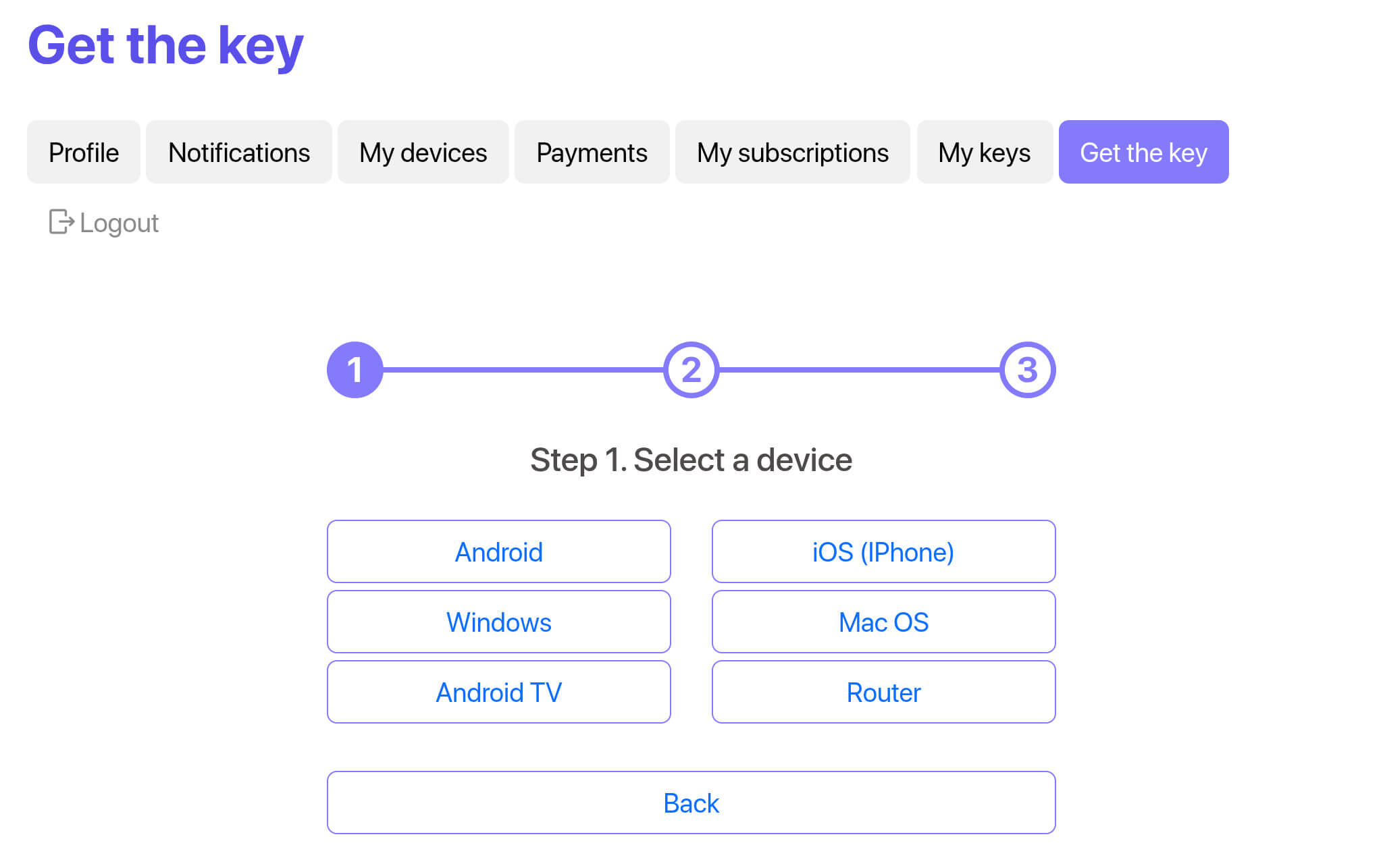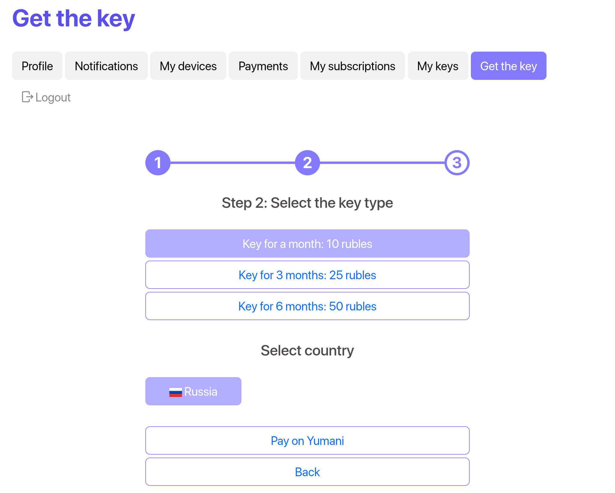 2. After authorization, you need to go to the tab “Get key” and select the desired device:
